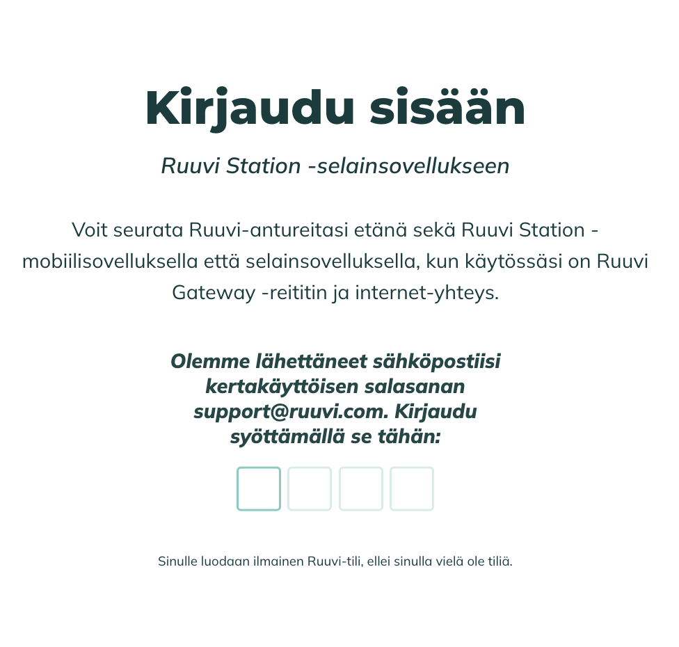 Kirjaudu sisään Ruuvi Web Station -käyttöliittymään osoitteessa ruuvi.com/fi/station. Saat sähköpostiisi salasanan (neljä merkkiä), joka syötetään salasana-kenttään sisäänkirjaantumisen yhteydessä. Tämä ei ole sama kuin Ruuvi Cloud aktivointikoodi.